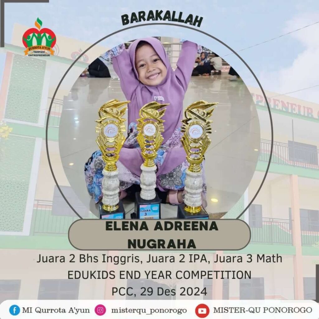 Ananda Elena Adreena Nugraha, yang telah meraih Juara 2 Bahasa Inggris, Juara 2 IPA, dan Juara 3 Matematika.
